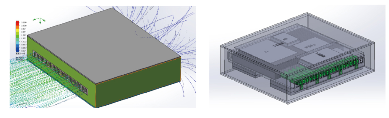 某機(jī)載設(shè)備采用中間獨(dú)立風(fēng)道的散熱方式, 熱功耗為215W,環(huán)溫65℃,芯片溫度116°C。 風(fēng)扇開(kāi)啟后,芯片最高溫度降至97℃,溫升僅為32℃。